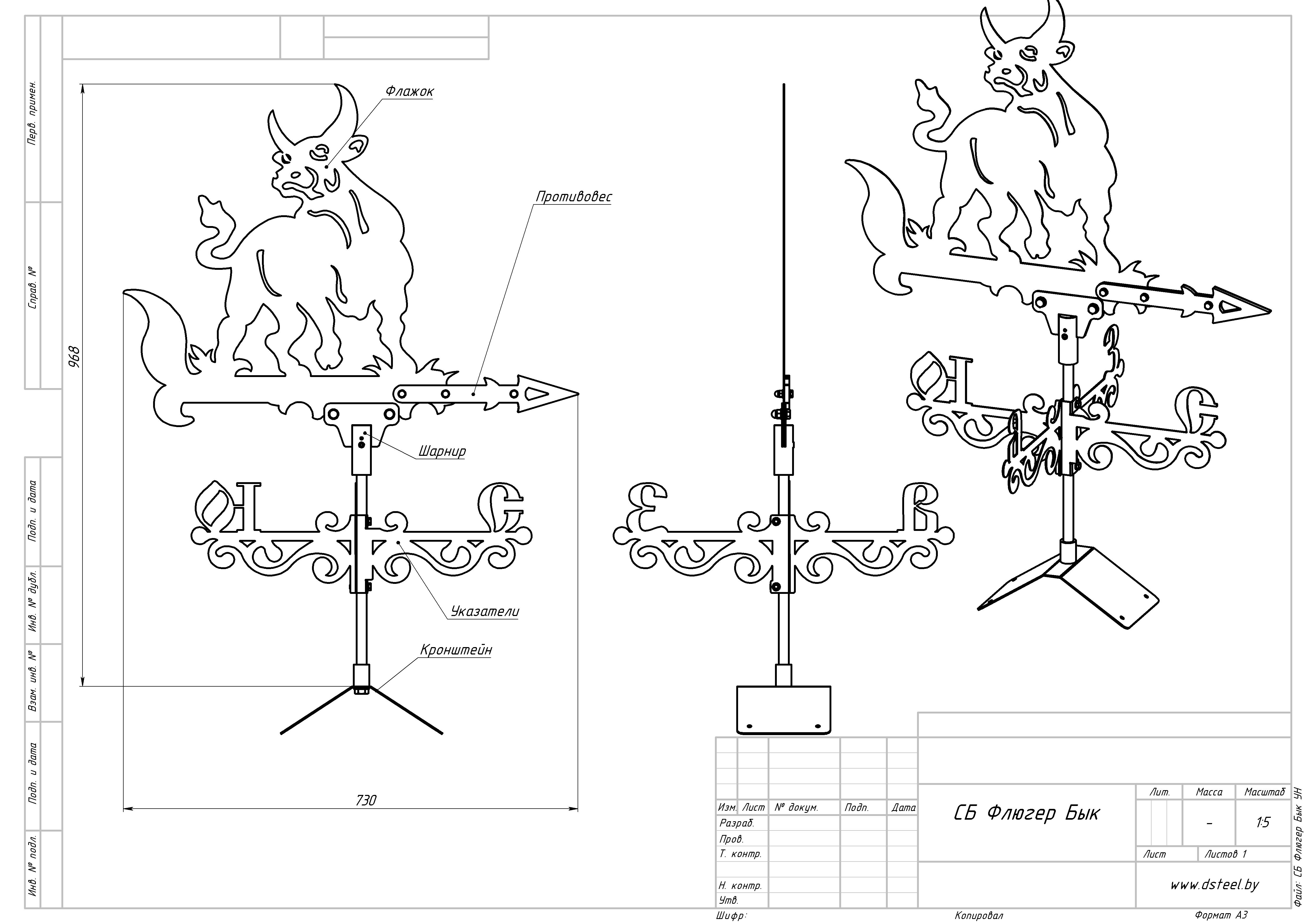 Мы вышлем Вам несколько макетов из которых Вы сможете выбрать более подходящий вариант который Мы отправим в работу. Наш метод производства гарантирует что Вы получите именно то что заказывали, Флюгер "Бык" будет иметь максимальную идентичность с макетом заказа, что является преимуществом сотрудничества с нами!
