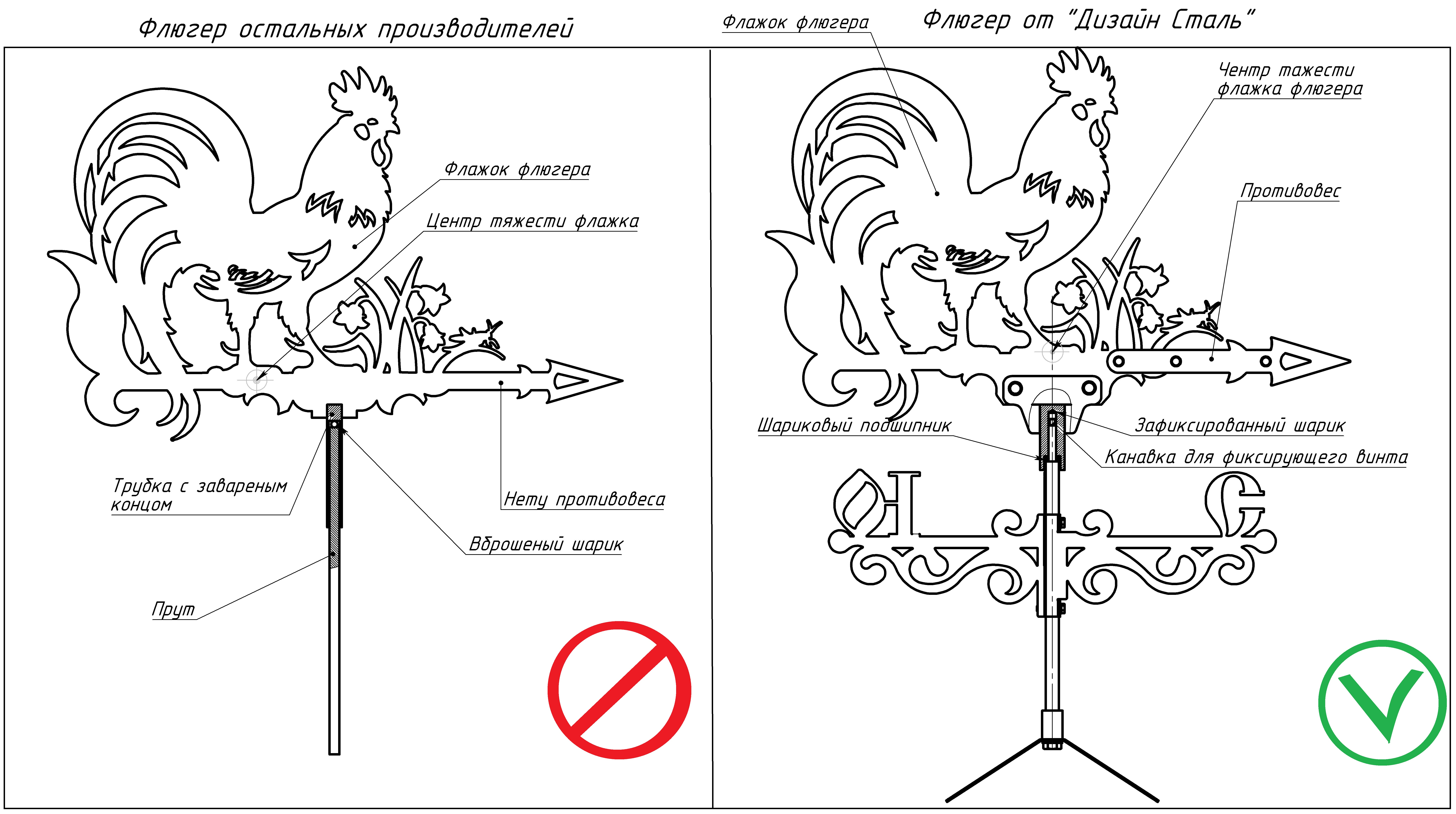 Часто можно встретить на строительных рынках, в магазинах стройматериалов и на интернет площадках флюгеры изготовленные без соблюдения этих основных требований, не проработанные конструкторами и изготовленные "на коленке". Что самое удивительное цены на такие флюгеры зачастую неоправданно высокие.