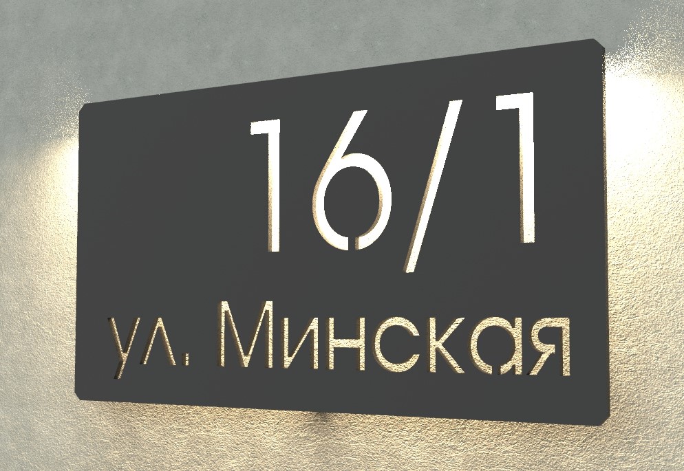 В листе металла толщиной 6-10 мм насквозь прорезается текст адресной таблички (используется трафаретный тип шрифта). Крепится данная табличка либо вплотную к стене, либо на некотором удалении. При креплении на некотором удалении от стены возможно установить подсветку с обратной стороны таблички, для подсветки стены за табличкой, что повысит читаемость адреса (особенно в темное время), а так же улучшит эстетику и привлечет больше внимания.