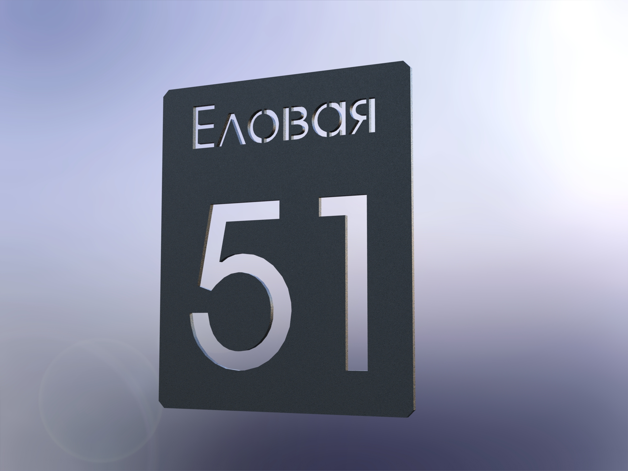 В листе металла толщиной 6-10 мм насквозь прорезается текст адресной таблички (используется трафаретный тип шрифта). Крепится данная табличка либо вплотную к стене, либо на некотором удалении. При креплении на некотором удалении от стены возможно установить подсветку с обратной стороны таблички, для подсветки стены за табличкой, что повысит читаемость адреса (особенно в темное время), а так же улучшит эстетику и привлечет больше внимания.